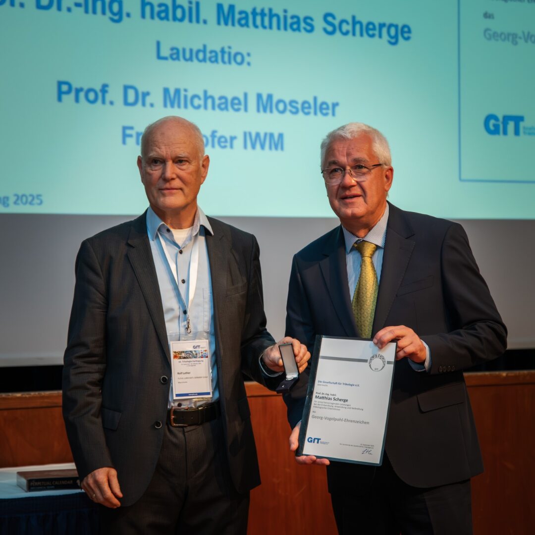 Die Gesellschaft für Tribologie e. V. (GfT) hat am 29. September 2025 Prof. Dr. Matthias Scherge, Geschäftsfeldleiter für Tribologie am Fraunhofer-Institut für Werkstoffmechanik IWM und Leiter des MikroTribologie Centrums µTC, mit dem Georg Vogelpohl Ehrenzeichen ausgezeichnet. Die höchste deutsche Auszeichnung im Bereich Tribologie würdigt Scherges langjährige wissenschaftliche und praxisorientierte Beiträge zur Erforschung und Minderung von Reibung und Verschleiß.