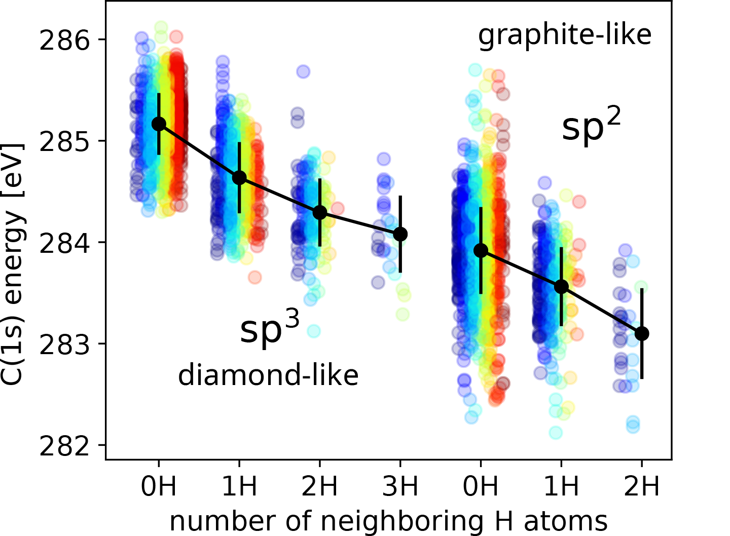 Wir haben bereits gezeigt, dass XPS-Peakpositionen durch Dichtefunktionaltheorie (DFT)-Berechnungen auf der absoluten Energieskala vorhergesagt werden können [1,2]. In der kürzlich veröffentlichten Zusammenarbeit mit R. Carpick von der University of Pennsylvania, USA, und F. Mangolini von der University of Texas at Austin, USA, vergleichen wir simulierte XPS-Spektren mit dem Experiment auf der absoluten Energieskala [3]. Wir zeigen, dass die weit verbreitete Interpretation der Identifikation von sp2- und sp3-Kohlenstoffen für reine Kohlenstoffmaterialien gültig ist. Jedoch muss diese in Frage gestellt werden, sobald das Material Wasserstoff enthält. Unsere Arbeit unterstützt daher Oberflächenwissenschaftler und -wissenschaftlerinnen bei der präzisen Charakterisierung kohlenstoffbasierter Materialien mittels XPS.