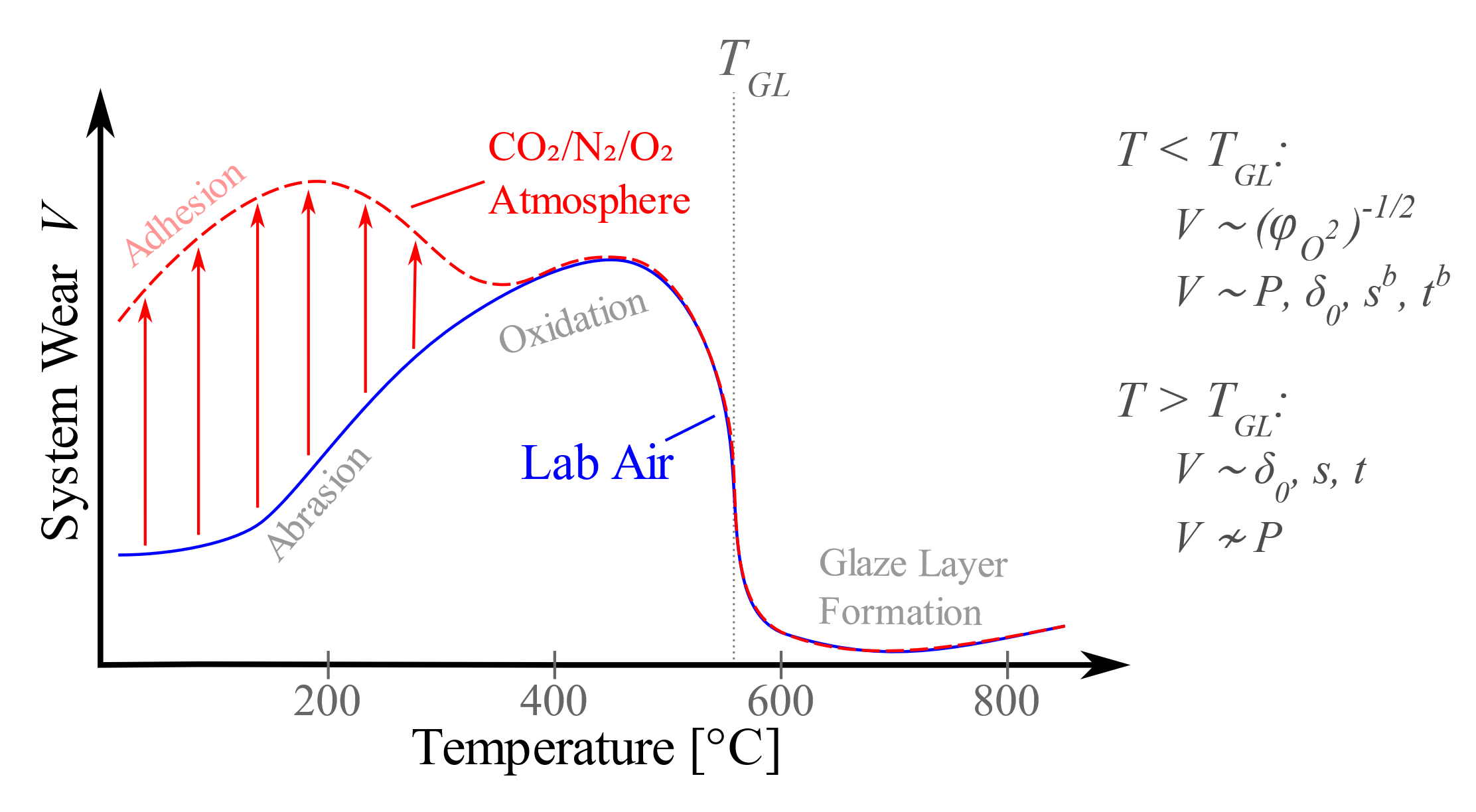 Die Temperatur hat einen signifikanten Einfluss auf das Verschleißverhalten, da sie den Wechsel der tribologischen Mechanismen von Abrasion zu Oxidation und Adhäsion von Verschleißpartikeln bis hin zur Bildung eines Glazelayers im HT-Bereich induziert. Die Verschleißpartikel, die für den tribologisch induzierten Sinterprozess des Glazelayers benötigt werden, liegen bereits bei niedrigen Temperaturen von 200 °C in vollständig oxidierter Form vor. Die Bildung eines verschleißmindernden Glazelayers ist daher hauptsächlich von der Temperatur abhängig, da diese den Sinterprozess direkt beeinflusst, so eine zentrale Erkenntnis dieser Arbeit. Der atmosphärische Einfluss auf das tribologische Werkstoffverhalten ist abhängig vom temperaturbedingten Verschleißregime. Bei niedrigeren Temperaturen findet in der sauerstoffreduzierten CO2/N2/O2-Atmosphäre ein Mechanismenwechsel von Abrasion zu Adhäsion statt. Im Gegensatz dazu wird die Bildung des Glazelayers durch den Wechsel der Atmosphäre nicht beeinflusst.